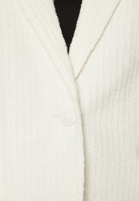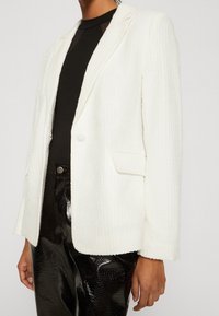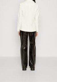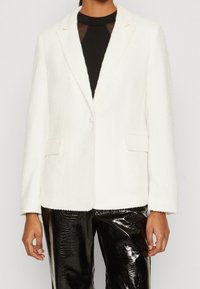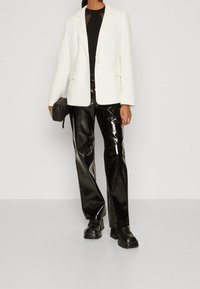 Femme portant un blazer blanc texturé sur un top en maille noire et un pantalon noir en cuir synthétique brillant avec motif crocodile.