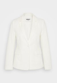 Blazer beige à double boutonnage en tissu léger avec de grands boutons, revers notched et une poche avant, associé à un jean en denim clair.