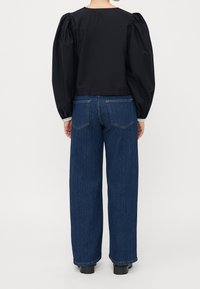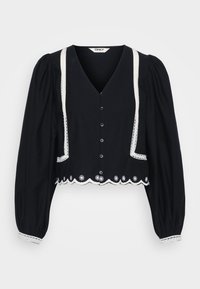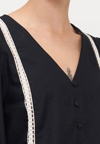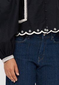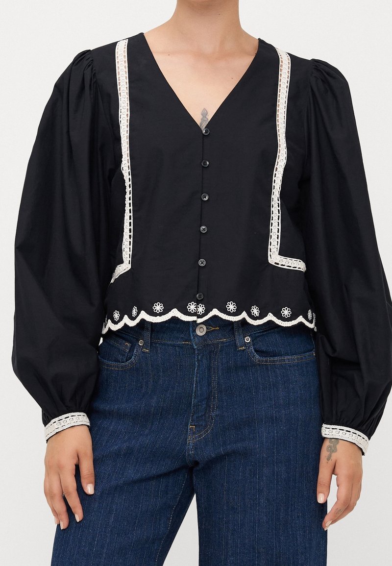 Blouse noire à boutons avec manches longues bouffantes, bordée de dentelle blanche le long des bords et des poignets, associée à un jean en denim bleu.