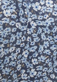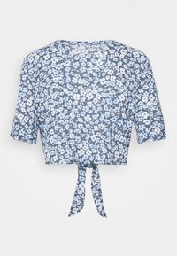 Haut court bleu à fleurs avec un col en V, des manches courtes et un lien à nouer à l'avant. Présente des fleurs blanches et bleu clair sur un fond bleu foncé.