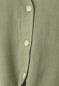 Blouse vert olive à col en V, manches courtes, fermeture à boutons ; nouée à la taille. Associée à une jupe légère en tissu soyeux vert clair.