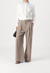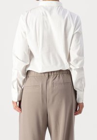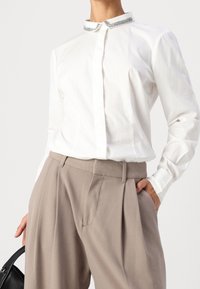Chemise blanche à boutons avec un col orné de bijoux, manches longues et design ajusté, associée à un pantalon taille haute beige clair.