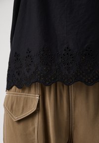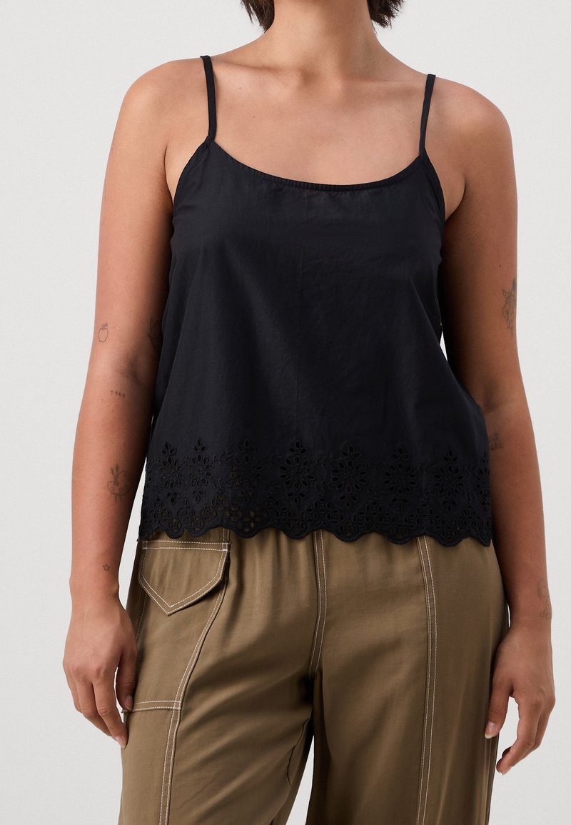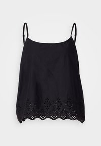 Haut caraco noir à fines bretelles, avec un ourlet festonné et un motif en dentelle délicate en bas. Tissu lisse avec une coupe décontractée.
