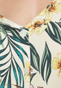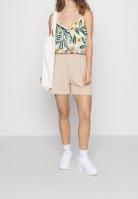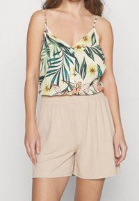 Débardeur à motif floral jaune avec des feuilles vertes et des fleurs roses, associé à un short beige côtelé à taille élastique.