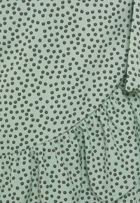 Jupe portefeuille verte à motifs avec des pois floraux noirs, ourlet à volants et détail noué à la taille. Tissu doux et léger.