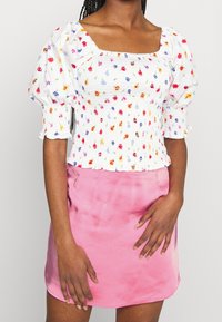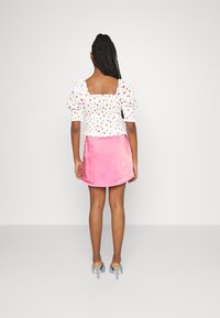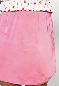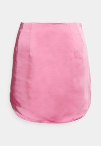 Mini-jupe rose à texture lisse et ourlet courbé, assortie à des chaussures légères bleu clair à enfiler avec un détail froncé.
