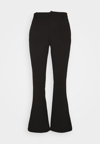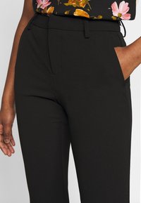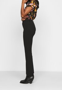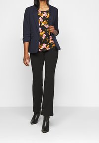 Femme portant un pantalon noir évasé, des bottines noires et un haut sans manches noir avec un motif floral rose et orange.