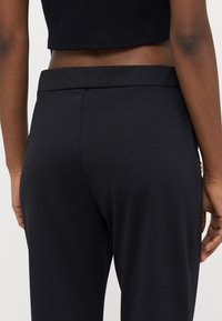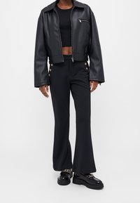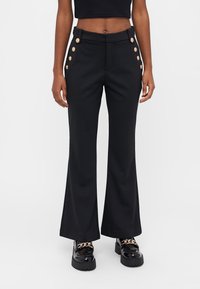 Pantalon évasé noir avec des boutons dorés décoratifs sur les hanches, confectionné dans un tissu lisse avec une coupe ajustée.
