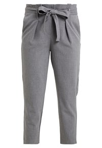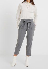 Pantalon gris sur mesure avec une taille nouée, présentant une texture lisse et une coupe fuselée. Porté avec un chemisier clair et des bottines blanches.