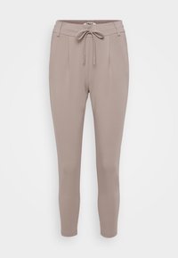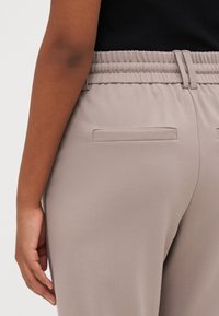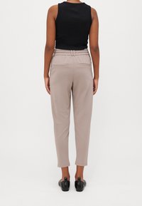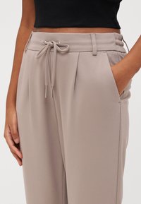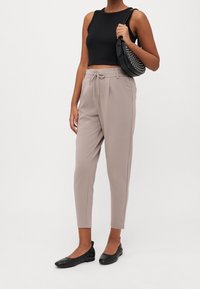 Femme portant un pantalon beige fuselé avec des plis à l'avant et une taille à cordon, assorti à des ballerines noires et un top court noir.