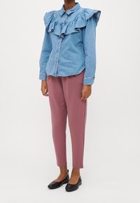 Personne portant un pantalon fuselé mauve avec taille à cordon, une chemise en denim bleu et des ballerines noires, debout devant un fond uni.
