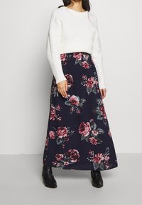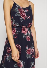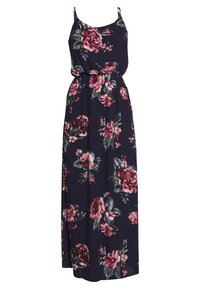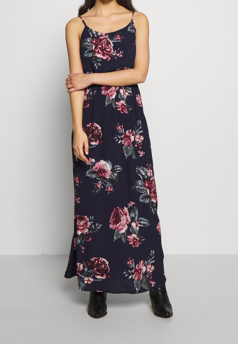 Robe maxi fleurie en tissu navy, ornée de motifs floraux roses et verts. Comprend des bretelles fines et une coupe décontractée. Bottines noires à la cheville portées.