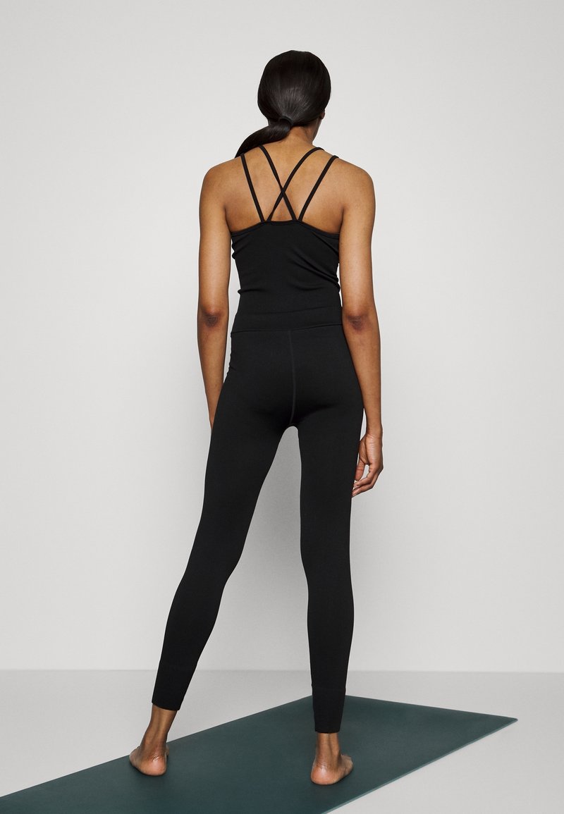 Femme debout pieds nus sur un tapis de yoga, portant un haut noir à bretelles et des leggings, vue de dos contre un mur uni.