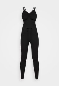 Combinaison noire avec un corsage ajusté, des découpes à la taille et des jambes larges et raccourcies. Confectionnée dans un tissu lisse et extensible.