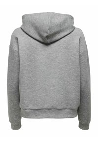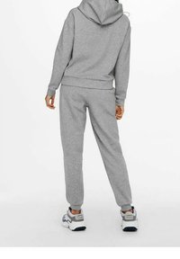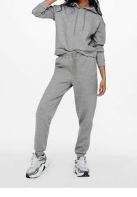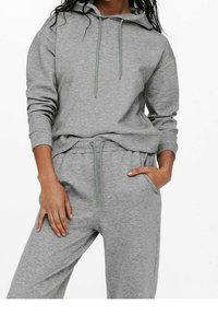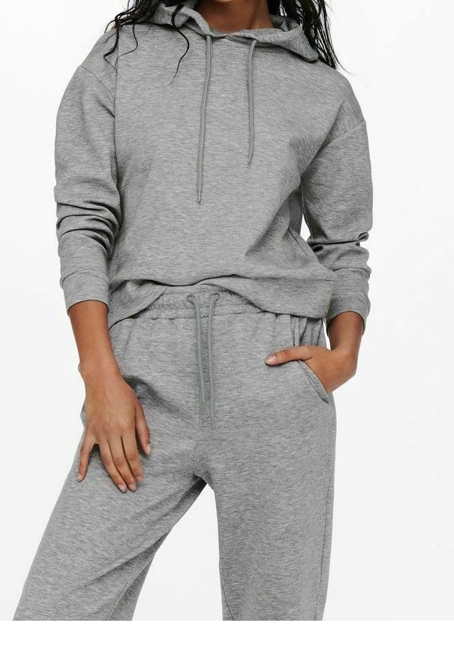 Femme portant un sweat à capuche gris clair et un pantalon de survêtement assorti, une main dans la poche et l'autre reposant sur la cuisse.