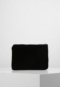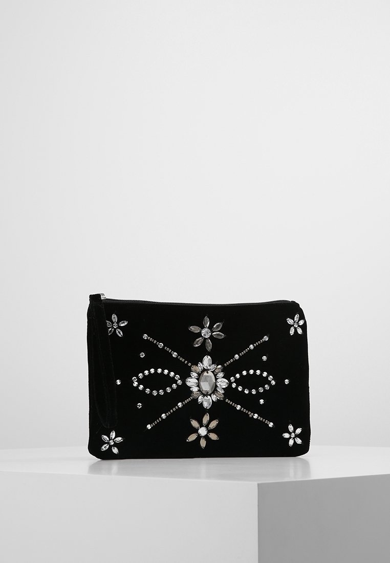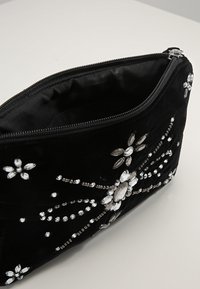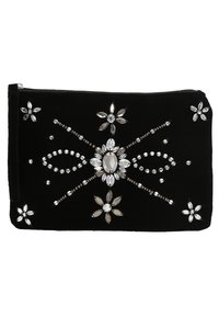 Pochette en velours noir ornée de délicats embellissements argentés. Elle présente une fermeture éclair, des motifs floraux et une surface texturée. Design compact.