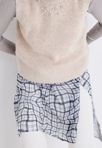 Personne portant un pull en maille crème avec un empiècement et des poignets à motifs noirs, associé à une jupe noire taille haute, debout devant un fond uni.