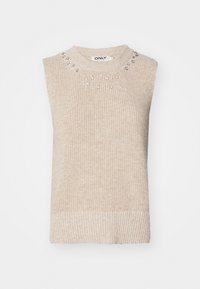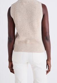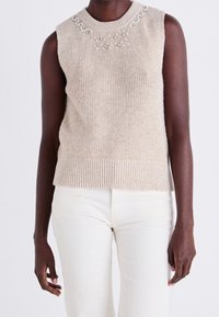 Personne à la peau foncée portant un haut beige sans manches en maille orné de perles et un pantalon blanc cassé, debout devant un arrière-plan uni.