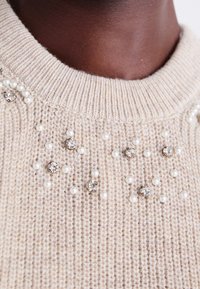 Pull beige avec un grand nœud en sequins scintillants aux tons dorés. Texture douce, poignets et ourlet côtelés. Porté avec un pantalon en cuir noir.