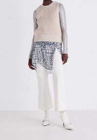 Personne portant un pull en tricot côtelé marron et blanc à manches longues et un jean large bleu clair, sur un fond uni.