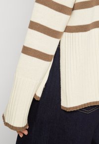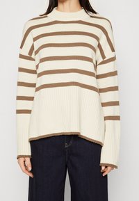 Femme portant un pull à manches longues crème et marron à rayures, avec la moitié inférieure côtelée, et un jean bleu foncé, debout devant un fond uni.
