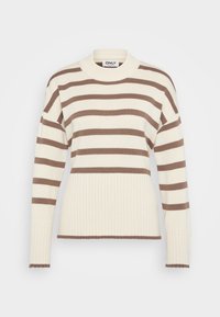 Pull en maille présentant des rayures horizontales noires et crème, col rond, manches longues avec poignets et ourlet côtelés.