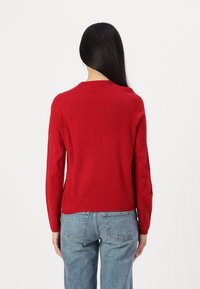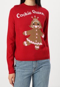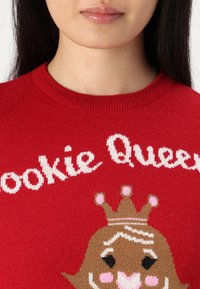 Pull rouge avec une fille en pain d'épice souriante portant une couronne et les mots « Reine des Cookies » au-dessus, associé à un jean bleu clair.