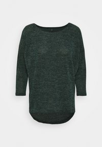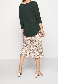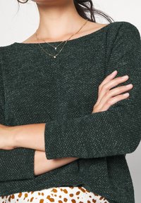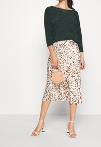Femme portant un pull texturé vert foncé et une jupe blanche à motif tacheté marron, accessoirisée avec de délicats colliers en or superposés.