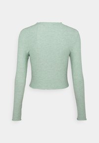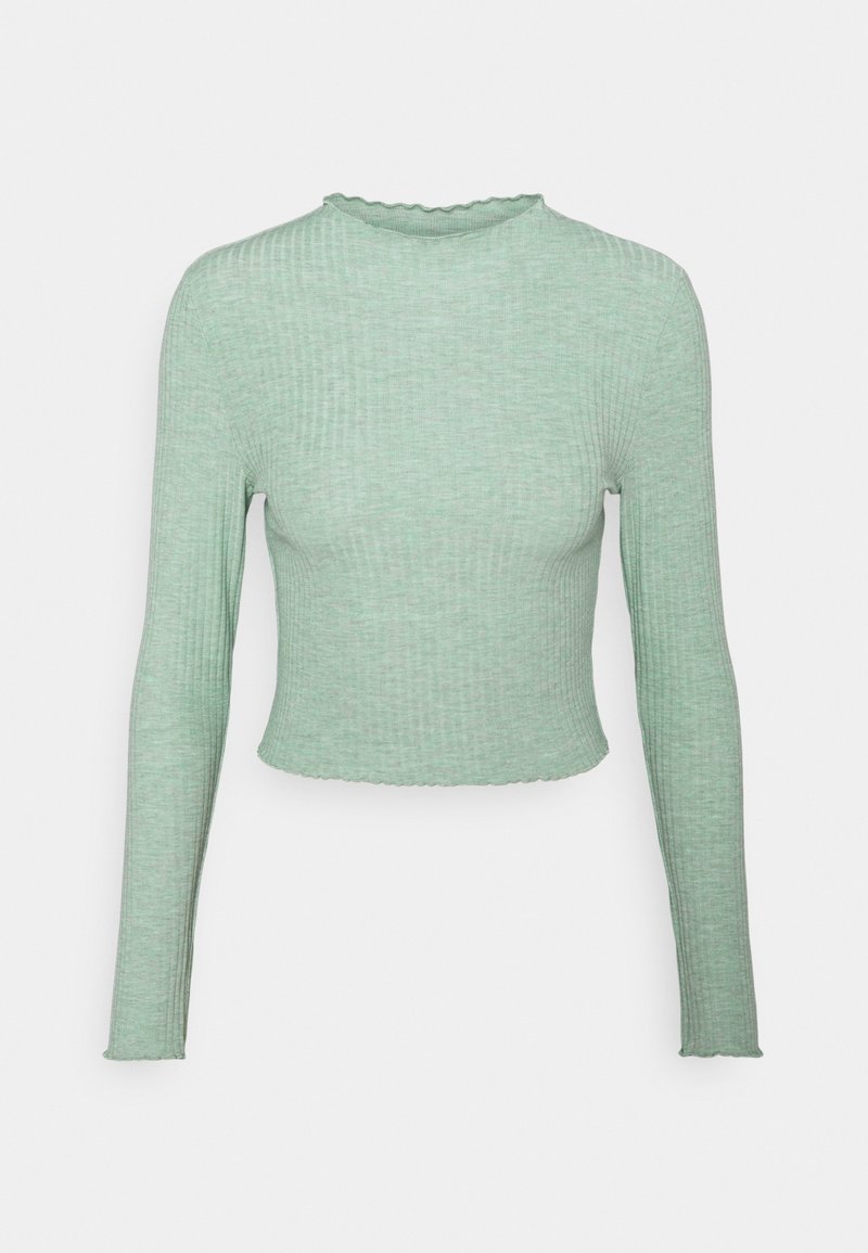 Un crop top à manches longues vert clair en tissu côtelé, avec un col rond et des détails de ourlet à volants.