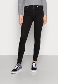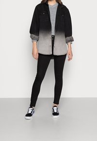 Des jeans skinny noirs présentent une taille haute, cinq poches et des ourlets effilochés. Associés à des baskets noires et bleues à motifs et à un pull gris.