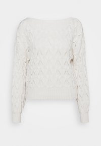 Pull blanc en maille avec une coupe ample, présentant un motif en losange et un ourlet côtelé. Associé à un pantalon noir taille haute avec fermeture à boutons.
