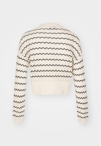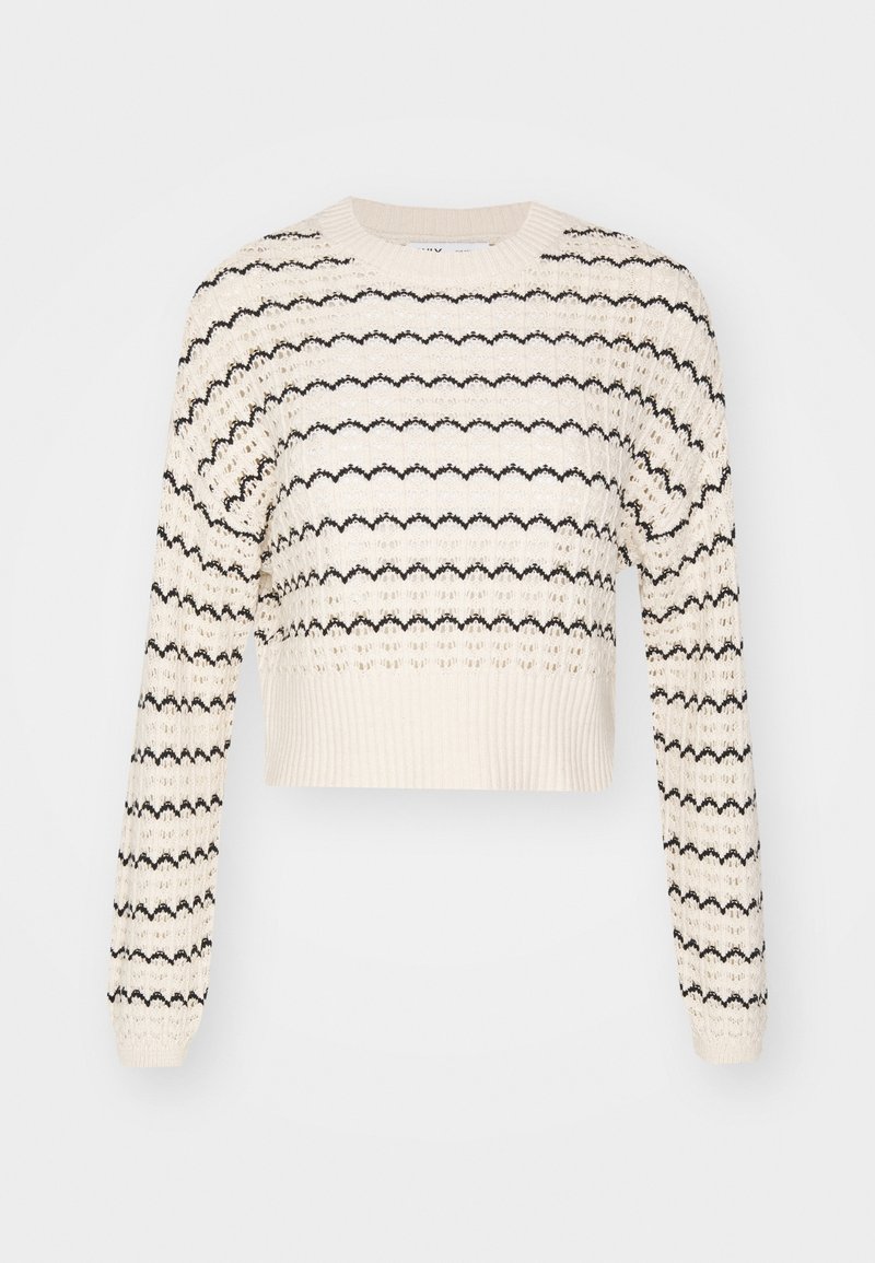 Pull court à base crème, avec des motifs rayés ondulés noirs. Texture en tricot, manches longues et ourlet côtelé.