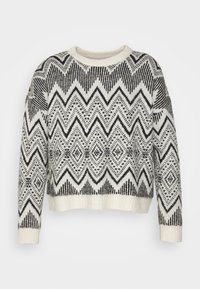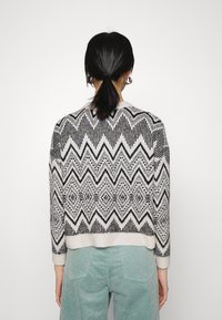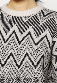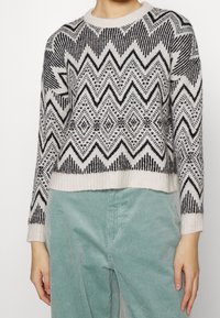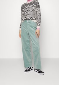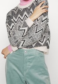 Personne portant un pull à motifs géométriques noirs et blancs associé à un pantalon en velours côtelé vert clair sur un fond uni.