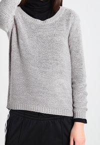 Personne portant un pull en maille gris clair par-dessus un haut à manches longues noir, avec un pantalon noir présentant des bandes blanches sur les côtés.