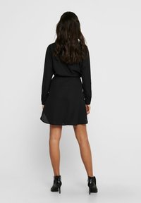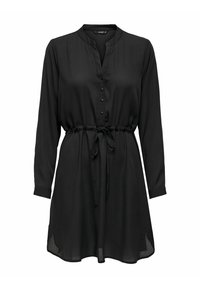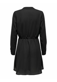 Femme portant une robe noire mi-longue à manches longues, boutonnée sur le devant, avec une ceinture nouée à la taille sur un fond uni.