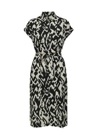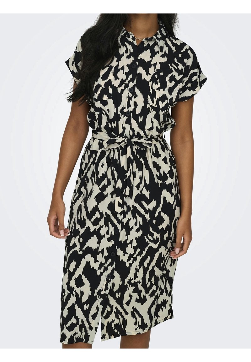 Femme portant une robe chemise à manches courtes avec un motif abstrait noir et blanc, ceinturée à la taille par une ceinture nouée.