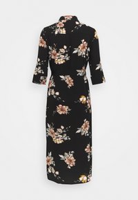 Robe chemise midi noire à imprimé floral pêche et blanc, manches trois-quarts, boutons sur le devant, col et ceinture à nouer à la taille.