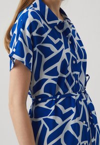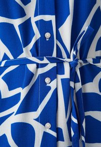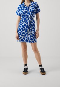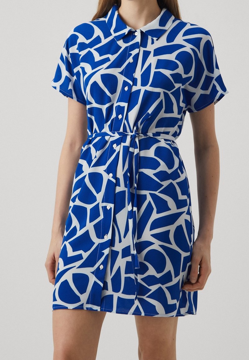 Robe à manches courtes bleu vif avec un motif abstrait blanc, dotée d'une patte de boutonnage à l'avant et d'une ceinture à la taille pour un ajustement personnalisable.