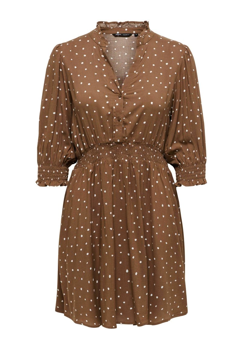 Robe marron longueur genou avec pois blancs, taille et poignets smockés, manches bouffantes trois-quarts et col en V boutonné.