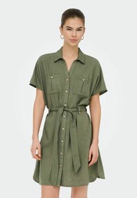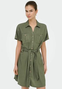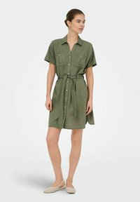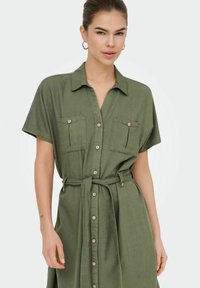 Femme portant une robe boutonnée manches courtes de couleur olive avec des poches poitrine et une ceinture nouée à la taille, debout devant un fond uni.