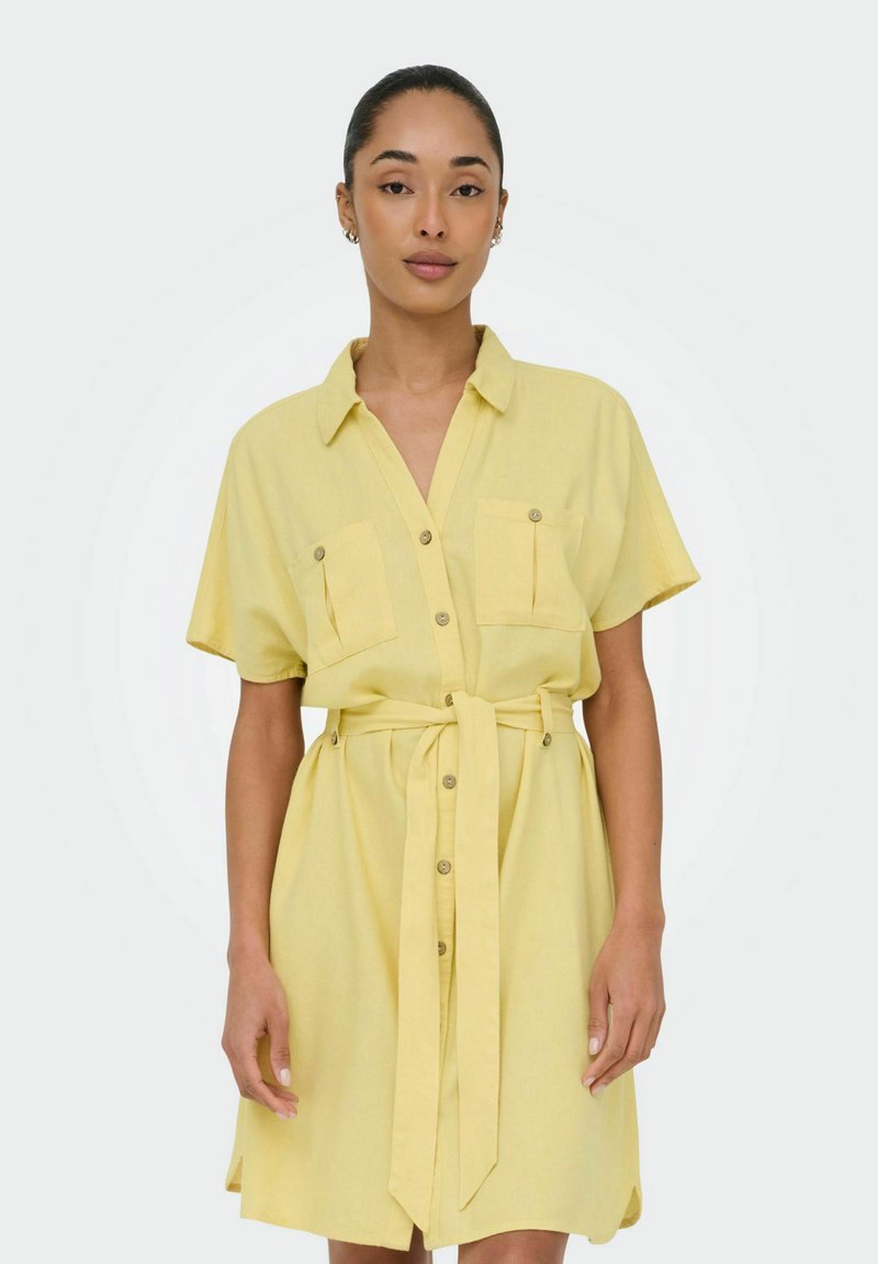 Femme portant une robe jaune à manches courtes avec des poches poitrine et une ceinture à la taille, debout devant un fond blanc.