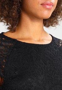 Robe en dentelle noire à manches courtes et silhouette cintrée. L'extérieur présente des motifs floraux complexes et un ourlet festonné.
