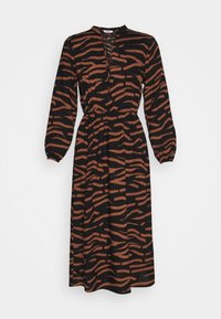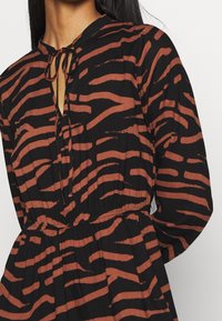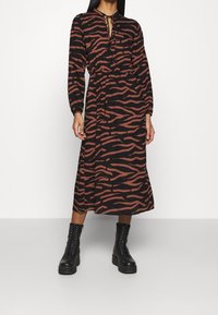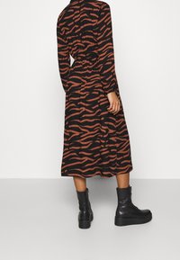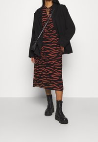 Femme portant une robe midi à manches longues à rayures zébrées noires et marron, avec des bottines noires montantes à lacets, debout devant un fond uni.