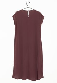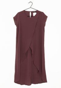 Robe bordeaux à manches courtes et longueur au genou, avec un détail superposé à drapé sur le devant, suspendue à un cintre noir.
