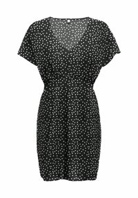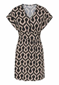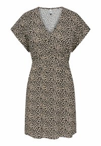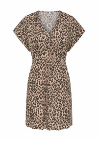 Femme aux cheveux bouclés portant une robe courte à imprimé léopard, des colliers en chaîne dorée et tenant un petit sac à main beige texturé.