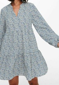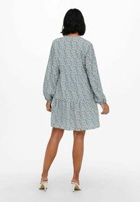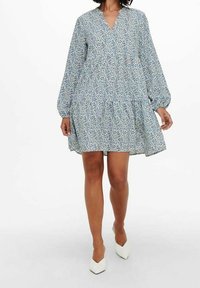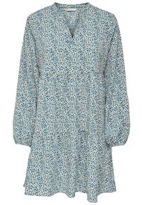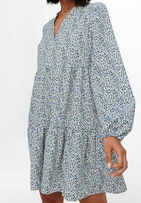 Robe à manches longues en tissu bleu clair avec des motifs abstraits en bleu marine et beige, dotée d'un décolleté en V et d'une conception de jupe à volants.