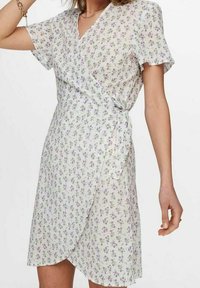 Robe portefeuille à fleurs en tissu léger, avec manches courtes, décolleté en V, et fond blanc orné de motifs floraux violets.