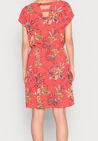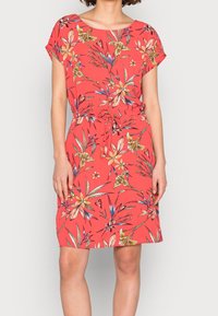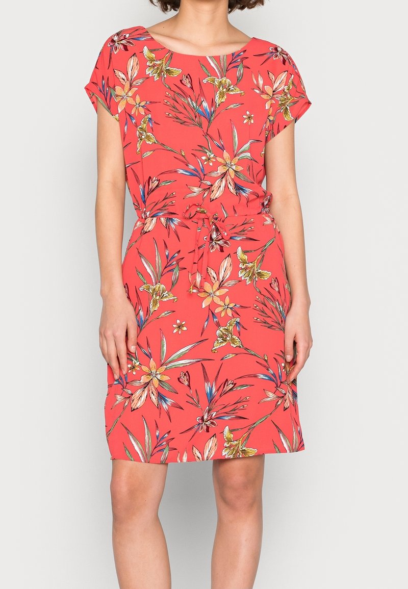 Robe florale corail avec un décolleté arrondi, des manches courtes et une taille à nouer. Présente un motif botanique coloré sur un tissu léger.