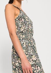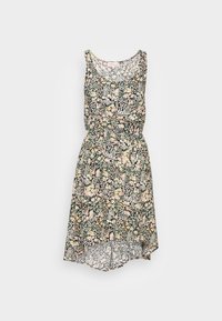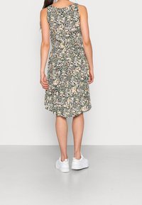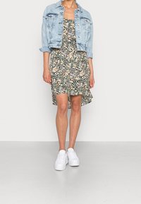 Femme portant une robe sans manches à motifs floraux avec un ourlet asymétrique et des baskets blanches à plateforme, debout devant un fond clair uni.