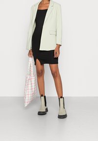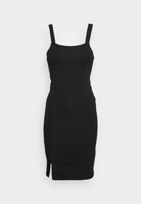 Robe noire sans manches avec fines bretelles, corsage ajusté, ourlet longueur genou, et une fente avant pour faciliter le mouvement. Texture lisse.